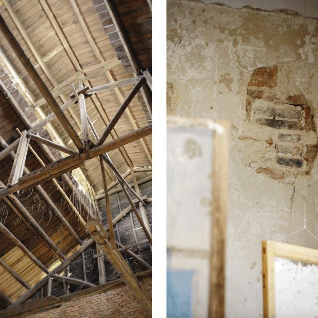 展览现场的木构房顶、斑驳墙壁