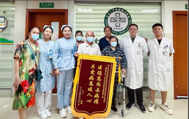 冯奶奶术后24小时内即恢复行走能力,彻底颠覆了高龄骨折患者“一病不起”的认知。患者家属特赠送“医德高尚去病痛,关爱病患暖人心”锦旗,这既是对关节外科医护团队的赞扬和认可,更是对南华医院医疗技术的深深信任。