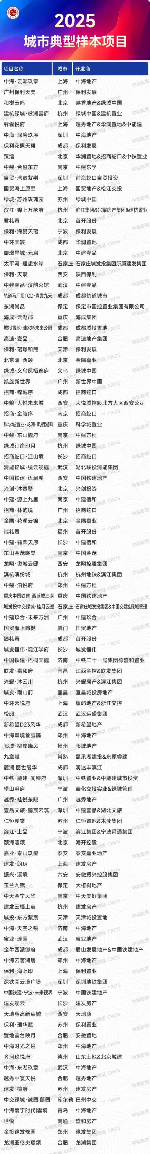 根据国家统计局数据,2025年1-5月,全国新建商品房销售面积同比下降2.9%,降幅较去年同期明显收窄,市场止跌回稳取得一定成效。从需求特征来看,改善性需求仍是新房市场重要支撑。6月国常会定调“更大力度推动房地产市场止跌回稳”,下半年预计各级政府将全力推动已出台政策落地见效,同时“好房子”建设相关政策及制度有望进一步完善,以优质供给带动房地产市场止跌回稳。在此背景下,中指研究院在中国房地产指数系统理论体系和架构的基础上,从百城价格指数样本项目中选取在所属城市有较强知名度和广泛影响力的典型样本项目,以“典型性”为基本原则,从销售表现、产品创新等方面对样本楼盘进行研究,最终得出“2025城市典型样本项目”,在肯定项目典范代表地位的同时,也为市场提供学习和借鉴的标杆。