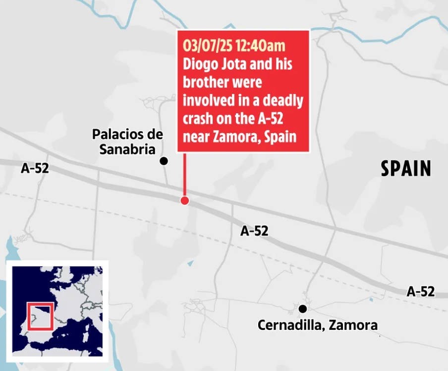 《太阳报》还发现,去年仅一个月内,就有超过40起关于A-52高速公路事故路段路况不佳的投诉,在靠近65公里标记点的Sanabria路段,路面的坑洼情况更为严重——这正是若塔车辆失事的确切地点。