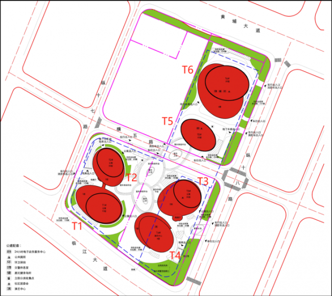 最靠近江边的T1、T4栋分别为13层高公寓和4层高演艺中心,中间T2、T3栋为32层高公寓,而T5和T6则分别是52层和59层商业商务大楼。