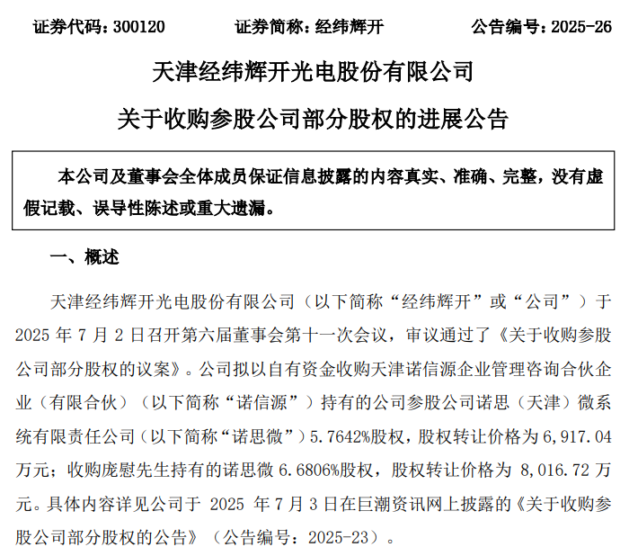 7月3日午间,经纬辉开发布了《关于收购参股公司部分股权的进展公告》,在宣布当日完成了对于收购庞慰先生持有的诺思微 6.6806%股权的第一批股权转让款,取得该股权权益,并合法持有诺思微表决权比例为 34.5603%的同时,也正面回应了诺思微的指控。