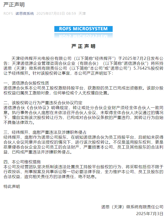 诺思微表示,经纬辉开拟收购的天津诺信源企业管理咨询合伙企业(有限合伙)(以下简称“诺信源合伙”)实际上是诺思微的员工股权激励持股平台,获激励的员工已完成出资缴款。该部分股权权益归属员工激励对象,任何单位或个人无权擅自处置。