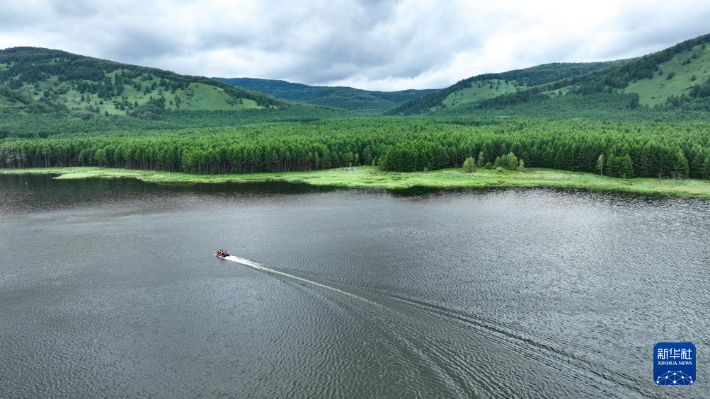 7月5日,游客在内蒙古阿尔山国家森林公园乌苏浪子湖景区乘船游玩(无人机照片)。