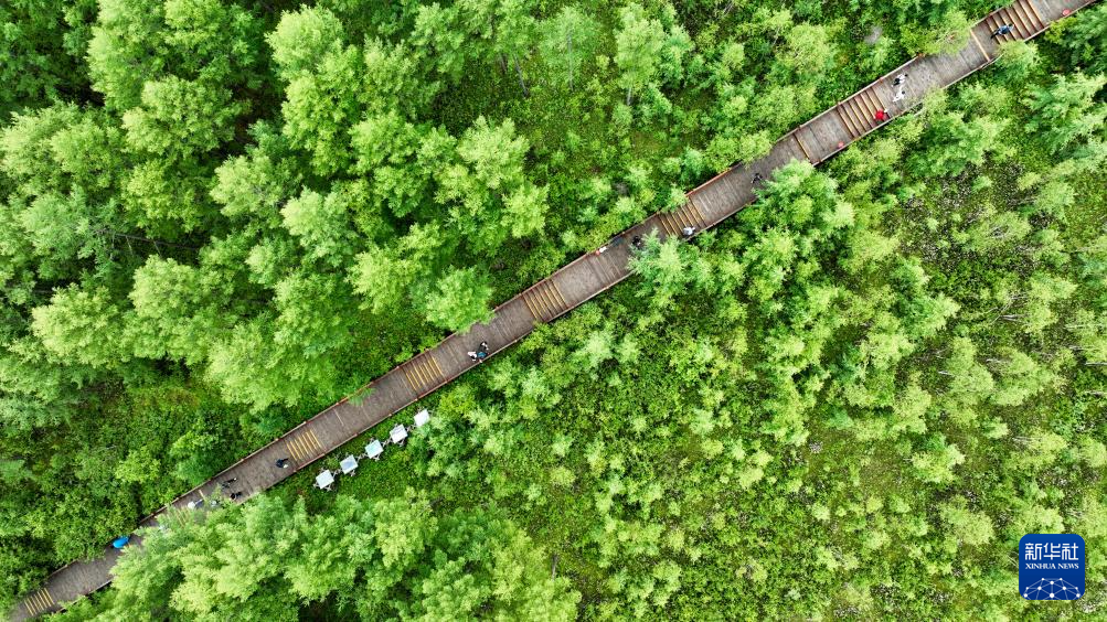 7月5日,游客在内蒙古阿尔山国家森林公园游玩(无人机照片)。