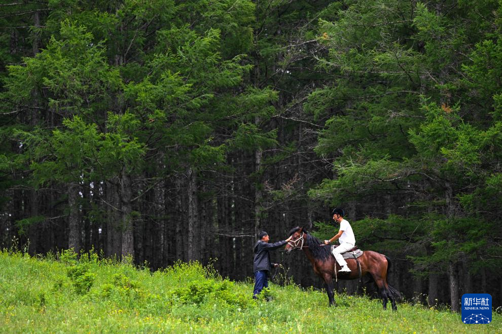 7月5日,游客在内蒙古阿尔山国家森林公园体验骑马。