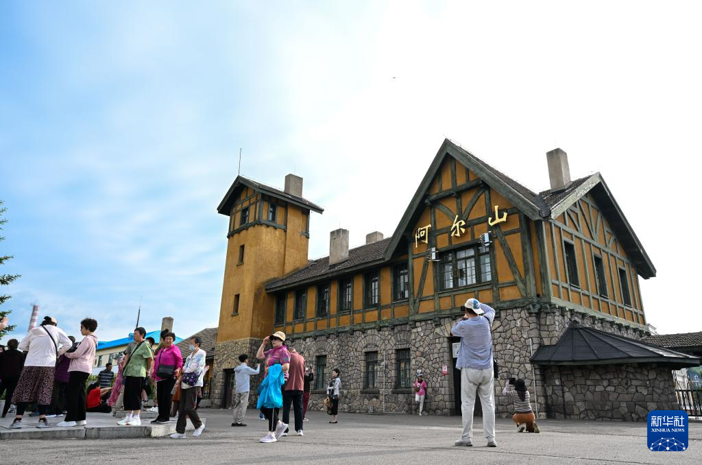 7月4日,游客在内蒙古兴安盟阿尔山市火车站游玩。
