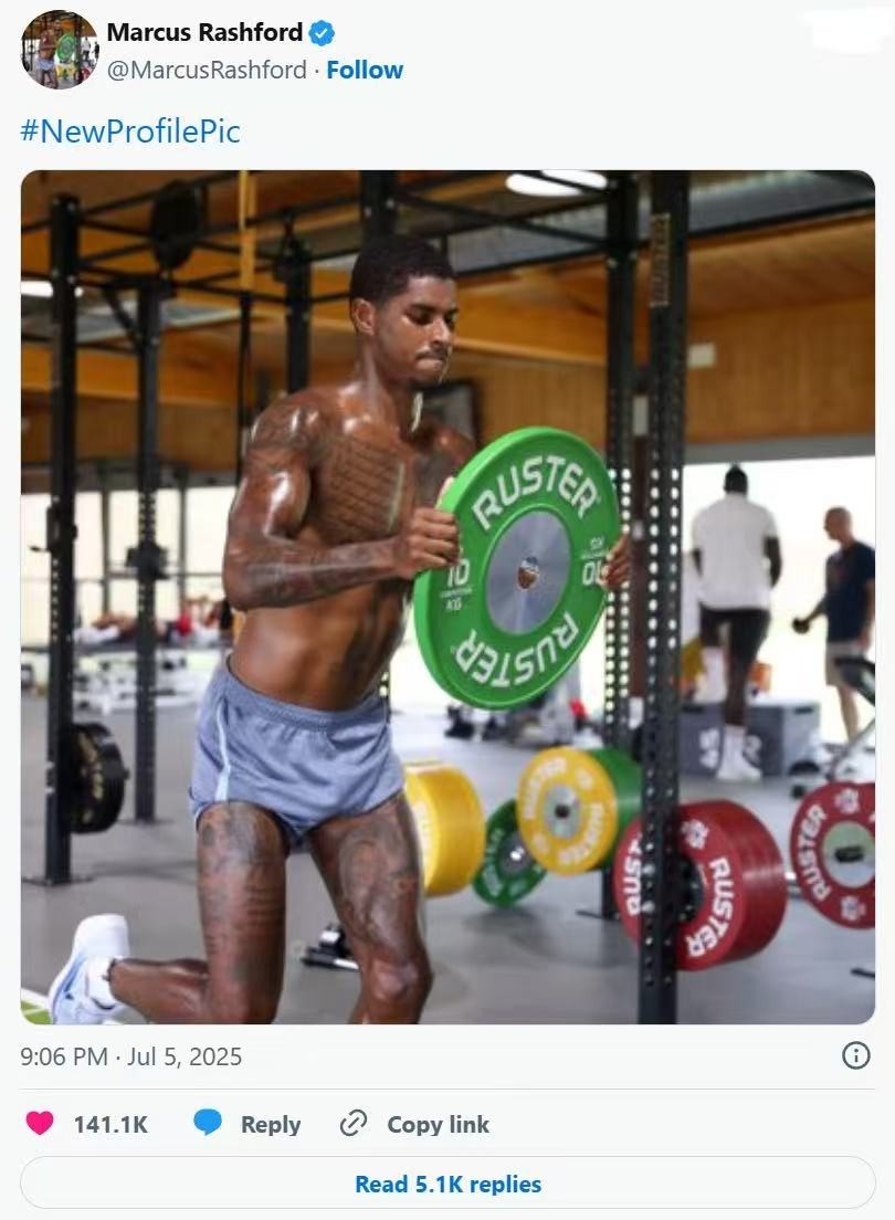 而拉什福德最近的社交媒体动态似乎进一步强调了这一点。他分享了一张自己举重的照片,并将其设置为他在社交媒体账户的新头像。这位英格兰球星上周已经在另一个社交媒体上发布了这张照片,但直到周六才在社交媒体上分享给他的粉丝。