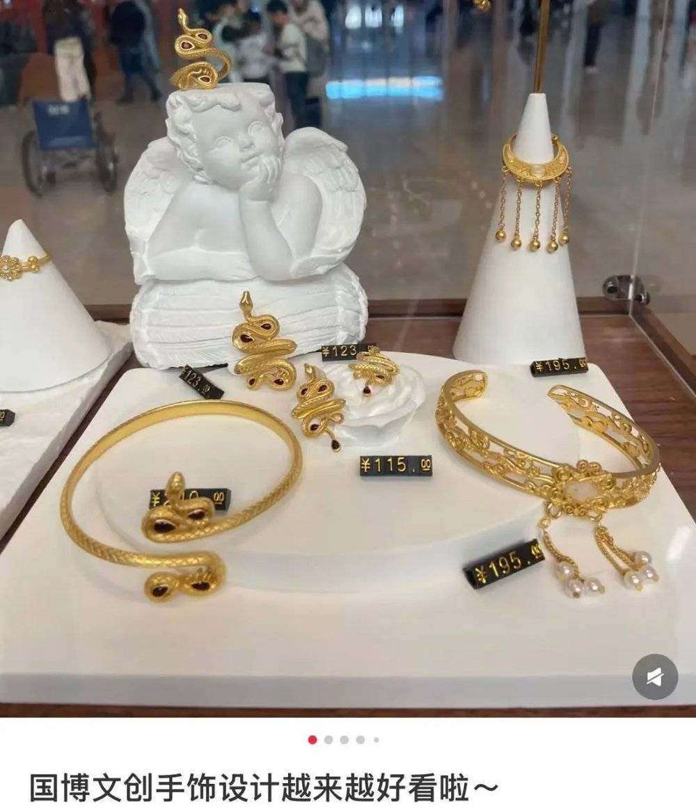 甚至有一些明明不缺钱、还戴着老铺黄金手镯的贵妇,看到博物馆里的首饰也走不动道了。博物馆里的首饰文创,设计灵感大多来源于展览里珍稀的国宝,样式比外面的专柜新奇多了。国博的黄金花项链,花瓣甚至还能一开一合,有两种戴法。看了博物馆里的首饰,甚至开始怀疑专柜里收的工艺费,到底是不是智商税。”