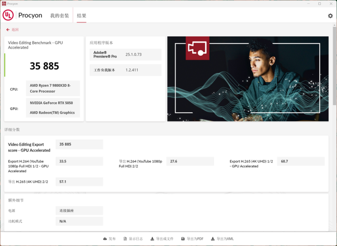 UL Procyon的视频测试中,整套平台的分数为35885,可以实现更高的创作效率,应对PR软件的视频剪辑是基本没有太大问题的。
