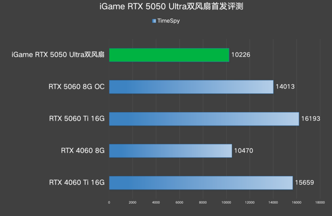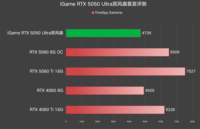 横向对比的话,我们可以看到,iGame RTX 5050 Ultra双风扇显卡的三项成绩中基本上FS和FSU都能领先RTX 4060。