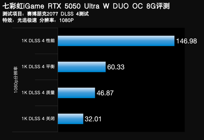《赛博朋克2077》作为最早一批支持DLSS 4技术的显卡,在这项测试中我们可以看到,1080p光追极速画质,如果关闭的情况下,游戏帧数仅仅为32.01帧,开启性能档位之后,游戏帧数提升到了146.98帧,平衡档位则是60.33帧,性能提升幅度非常巨大,游戏画面更为丝滑流畅,如果你的游戏支持DLSS 4的话,强烈建议开启,毕竟游戏画面没有降低的同时,游戏感受更流畅。