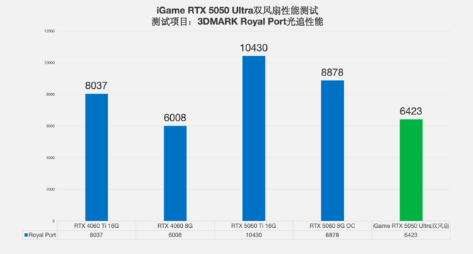光线追踪测试方面,这款显卡的测试分数为6243,测试结果给出的分数来看的话,iGame RTX 5050 Ultra双风扇显卡能够实现95以上的2K分辨率《战地5》游戏表现,性能表现非常出色,横向对比的话,这款显卡的分数超过了RTX 4060和RX 7650GRE。