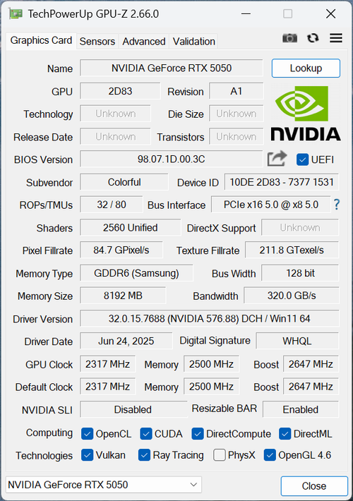 GPU-Z对目前这款显卡的识别还不是非常完全,从已有的信息来看,这款显卡的显存部分为8GB的GDDR6,和此前发布的所有RTX 50系列显卡有明显的差别,其次本次显卡的驱动部分,我们使用的是官方直接发布的576.88版本驱动。系统版本的话,还是新版的24H2,并且显卡开启一键超频进行测试,下面为本次的测试结果部分。