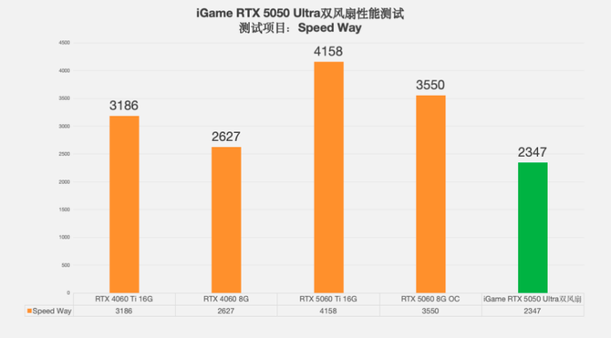 横向对比的话,从上面的性能参数可以看到,七彩虹全新的iGame RTX 5050 Ultra双风扇显卡的综合得分基本上和RTX 4060保持一致,差距不是很明显。
