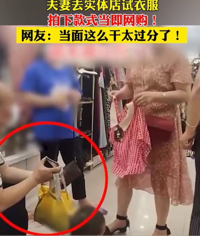 他们给孩子挑好衣服,孩子也试穿了,效果还不错。结果呢,这夫妻俩二话不说,直接掏出手机,对着衣服就是一顿猛拍,拍完同款,居然就在店家眼皮子底下,果断网购了!