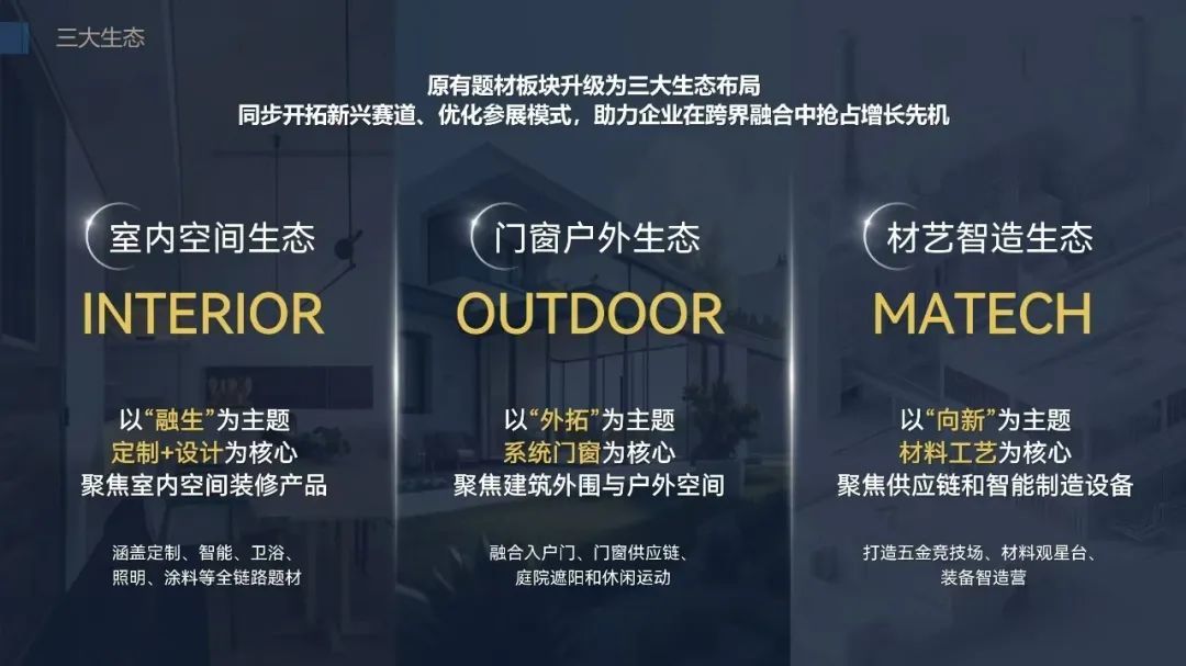 2024年,居然智慧家发布人车家战略,红星美凯龙官宣“3+星生态”战略,小米“人车家全生态”战略正式启动;2025年,欧派家居多次提到正从“全品类家居制造商”向“全场景生态服务商”蝶变,作为大家居行业风向标的广州建博会今年也将传统品类分区整合升级为室内空间、门窗户外、材艺智造“三大生态”。