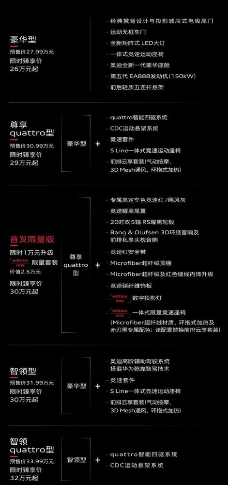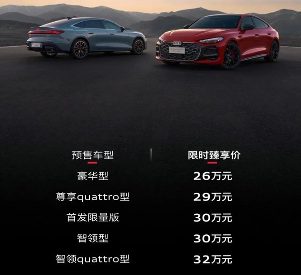 豪华型预售价27.99万元,限时臻享26万元起,尊享quattro型预售价30.99万元,限时臻享29万元起,首发限量版限时臻享价30万元起,智领型预售价31.99万元,限时臻享价30万元起,智领quattro型预售价33.99万元,限时臻享价32万元起。