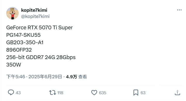 而RTX 5070 Ti SUPER,将搭载GB203-350 GPU,与RTX 5070 Ti一样拥有8960个CUDA核心,对应的PCB设计为PG147-SKU55,不过换用3GB GDDR7模块后,显存容量从16GB提高至24GB,不过整卡功耗也会由300W提高到350W。类似做法的还有RTX 5080 SUPER,维持相同的CUDA核心数量,显存容量增至24GB,整卡功耗提高至415W。
