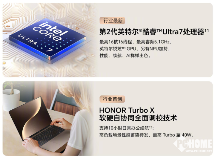 荣耀MagicBook Art 14 2025最高搭载第二代英特尔酷睿Ultra 7 255H处理器,内置锐炫Arc 140T显卡,搭载AI专属芯片NPU,支持实时语言翻译、自动化推理等AI应用运行,CPU+GPU+NPU算力可达96TOPS。散热依旧采用高模量铝材质风扇+静音风扇设计+超薄VC+超薄铜散热鳍片的散热模组设计。在性能释放方面,荣耀MagicBook Art 14 2025搭载了与Pro系列相同的HONOR Turbo X技术,瞬时性能释放最高可达40W,在大文件打开、大型应用启动等高性能需求场景下,为用户提供充足的性能释放,减少等待时间。