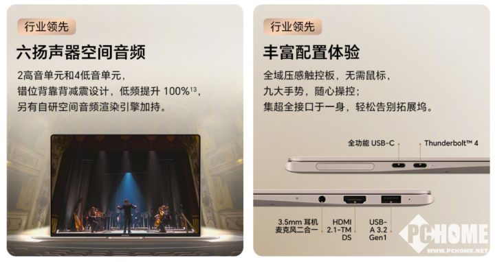 其他方面,该笔记本配备了120mm²超大面积全域压感触控板;配备黄金智能天线设计;支持智能风扇策略;配备HiFi级6扬声器;配备了60Wh电池,支持8小时办公续航。接口包含一个Thunderbolt 4接口,一个全功能USB-C接口,一个USB-A 3.2 Gen1接口,一个HDMI 2.1-TDMS接口,一个3.5mm耳机麦克风二合一接口。