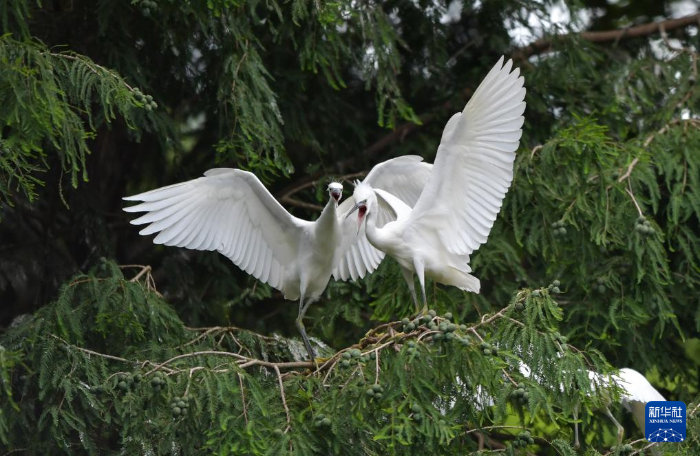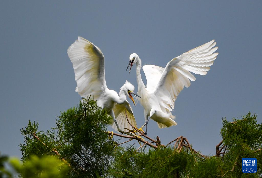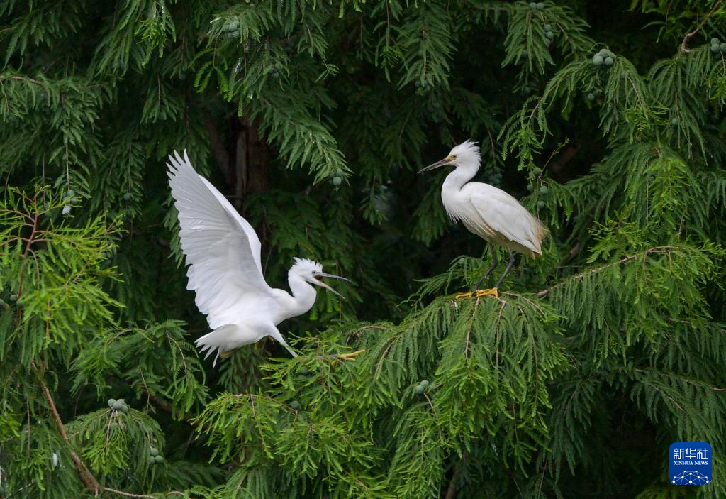 7月7日,两只白鹭在昆明滇池海洪湿地公园嬉戏。