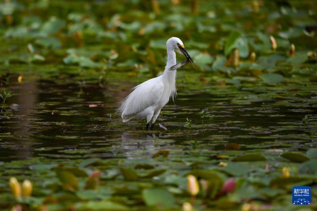 7月7日,一只白鹭在昆明滇池海洪湿地公园内捕食。
