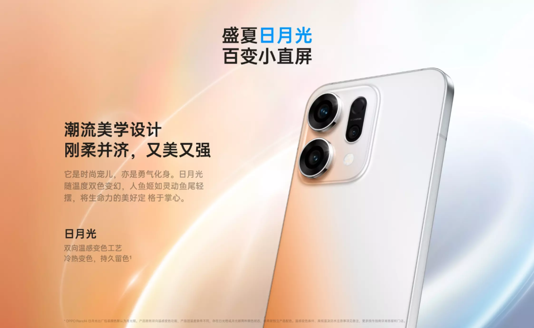 OPPO Reno14 日月光最大亮点就是采用了双向温感变色工艺,变色前是月光银,变色后是日光橙配色。