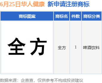 证券之星消息,根据天眼查APP数据显示,近日安徽华人健康医药股份有限公司新提交“全方”商标注册申请。商标申请详情如下: