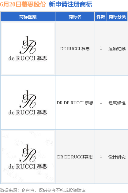 证券之星消息,根据天眼查APP数据显示,近日慕思健康睡眠股份有限公司新提交“DR DE RUCCI慕思”、“DR DE RUCCI 慕思”等3件商标注册申请。商标申请详情如下: