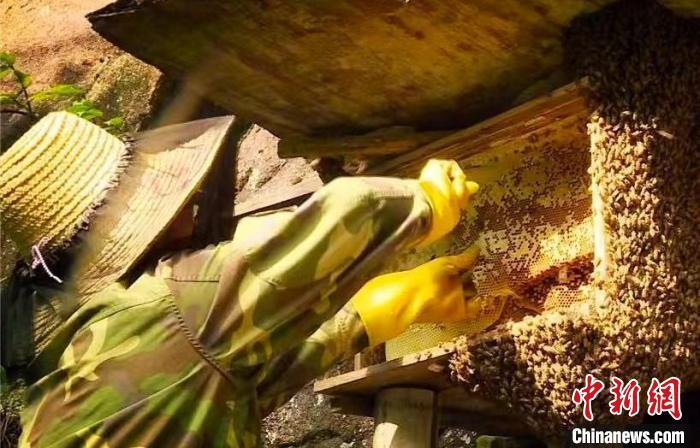 正在采蜜的村民。 唐诗文 摄