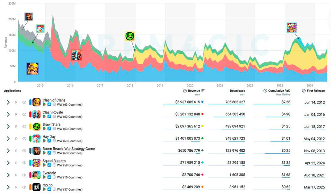 而最近的情况则甚至更加严峻:在2025年5月期间,《爆裂小队》仅获得了120万美元的收入——对于Supercell来说,这是一个极低的月收入数据,至少《荒野乱斗》和《Clash Royale》(皇室战争)在全球发布后都从未出现过这样的低迷表现。