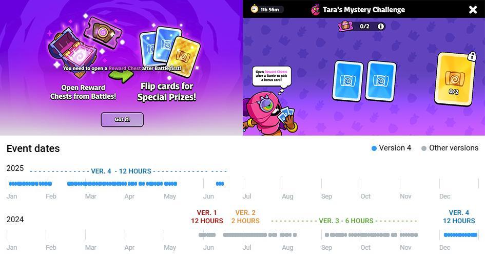 另一个值得注意的活动是塔拉的神秘挑战,根据运营活动与更新日历,它已出现近200次。这是一个直接的日常活动:玩家完成一场比赛后获得一张奖励卡,只有在所有之前的卡片都被揭示后才能解锁最终奖励。大多数版本总共包含两到五张卡片。虽然游戏玩法保持不变,但该活动很好地延长了游戏时长并提高了每日登录率。