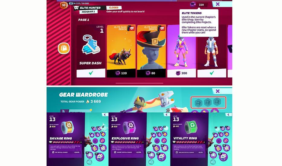 当玩家达到30级时,角色会进入“精英联赛”,等级进度重置为1级,但升级不再提升属性。玩家将解锁三个戒指槽位,并添加被动属性加成。精英联赛附带时长三个月的精英通行证,玩家可以通过完成任务获得精英代币购买奖励,主要还是装饰品。此外,还有24美元的高级选项提供独家皮肤。