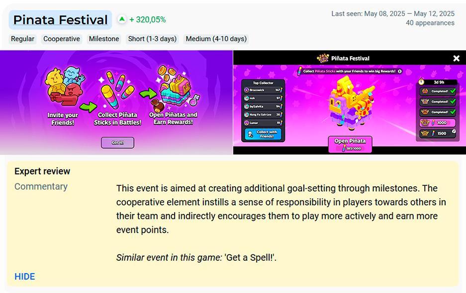 以皮纳塔节为例——游戏中最频繁的合作活动,迄今已举办40次。它遵循一个简单的里程碑格式:玩家在常规比赛中收集皮纳塔棒,并将它们贡献给与最多四个其他朋友共享的进度池。