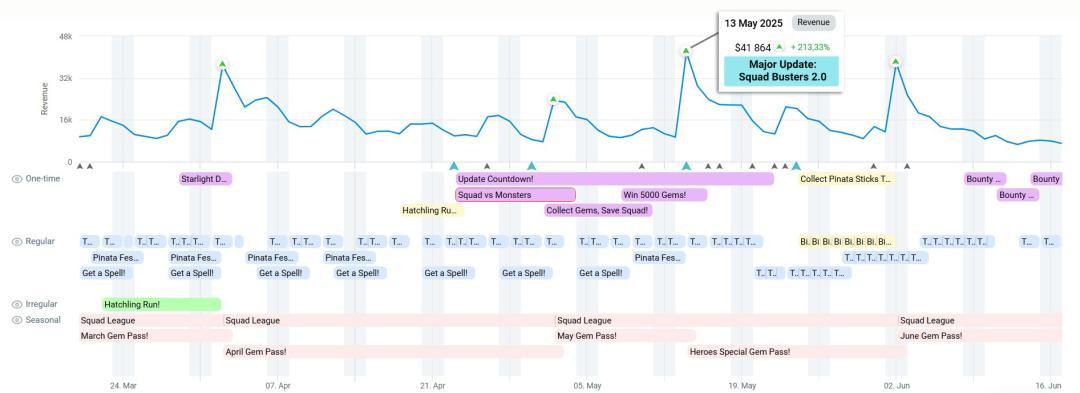 通过AppMagic的运营活动与更新日历,可以发现从2024年6月到2025年6月,《爆裂小队》举办了70个不同的活动——虽然不如《荒野乱斗》的128个那么多,但对于一款新发布的游戏来说仍然令人印象深刻。然而,虽然活动数量值得注意,但它们的多样性和质量同样重要。