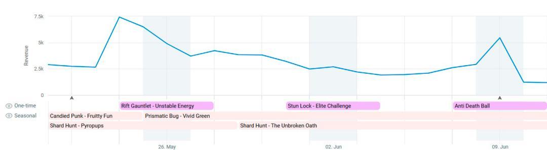 运营活动:过度依赖核心循环。通过AppMagic的“运营活动与更新日历”工具,可以发现两款游戏都过度依赖结构化活动、里程碑奖励和赛季通行证。由于大多数活动都与游戏本身缺乏打磨和多样性的核心循环绑定,因而即便是最精良的系统也会开始变得重复单调。