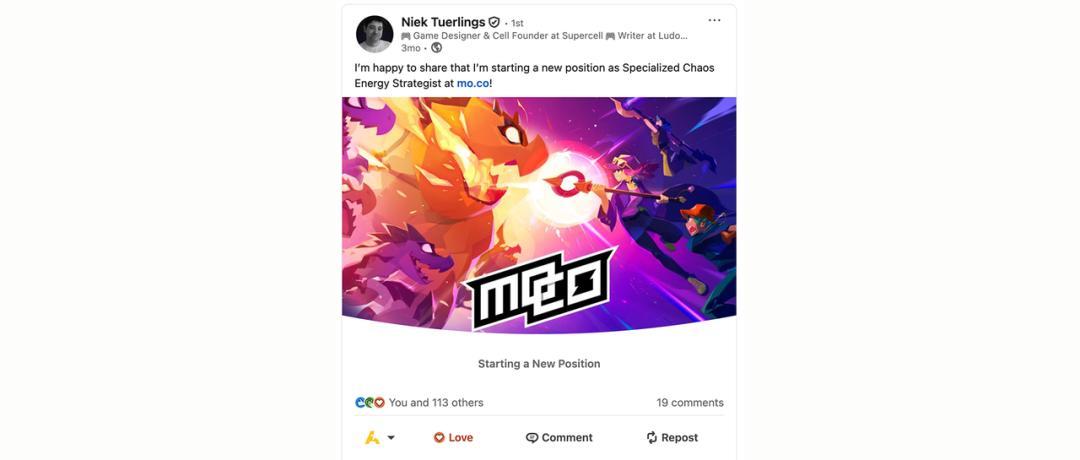 同时,Supercell还使用了一种有趣的B2B宣传手段来引起业内好奇:数十名员工在LinkedIn上将“mo.co”列为工作单位,配以诸如“专业混沌能量战略师”等古怪头衔。