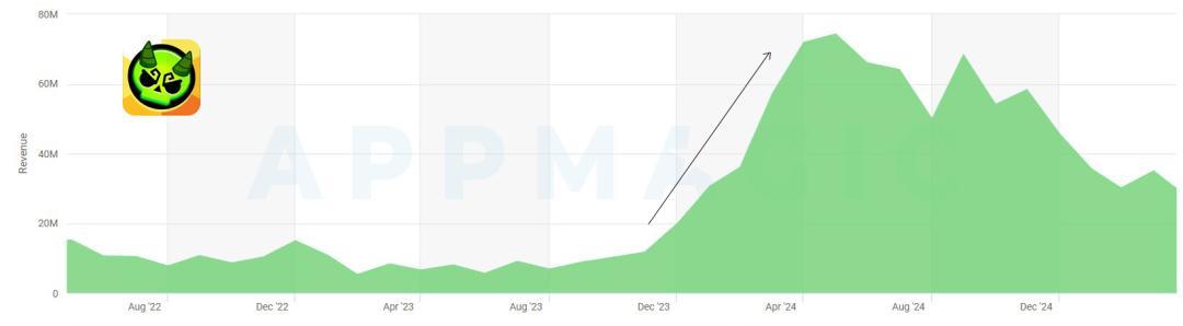 然而,随着一次次更新,《爆裂小队》逐渐将其变现模式转向更加中度的模式,从AppMagic的变现情报工具中可以看出: