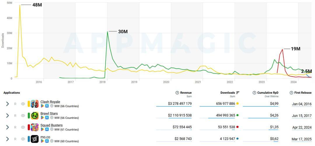 在首月,《代号MOCO》收获了约250万次下载;而《爆裂小队》则以350万安装量起步,并在2024年6月达到1900万的峰值,这比《皇室战争》的巅峰时期(4800万)少了近2.5倍。