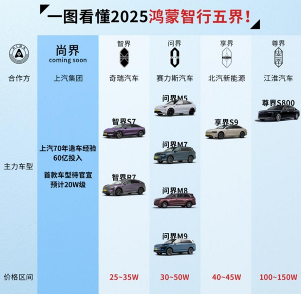 从目前鸿蒙智行的布局来看,尊界定价在70-100万+,问界M9定价在46-57万,享界S9定价在30-45万,智界R7定价在25-35万,问界M8则是吃掉35-40万的市场份额。