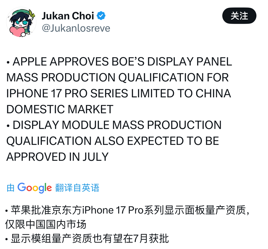 据博主@Jukan Choi 在推的发文称,苹果批准京东方iPhone17 Pro系列显示面板量产资质仅限中国国内市场,显示模组量产资质也有望在7月获批。