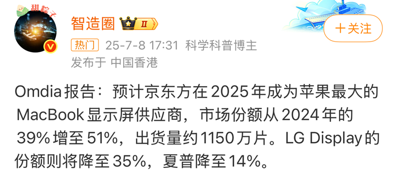 在此消息之前,透露过京东方与苹果合作的新闻。根据博主 @智造圈 的透露,Omdia报告称,预计京东方在2025年成为苹果最大的MacBook显示屏供应商,市场份额从2024年的39%增至 51%,出货量约1150万片。LG Display的份额则将降至 35%,夏普降至14%。