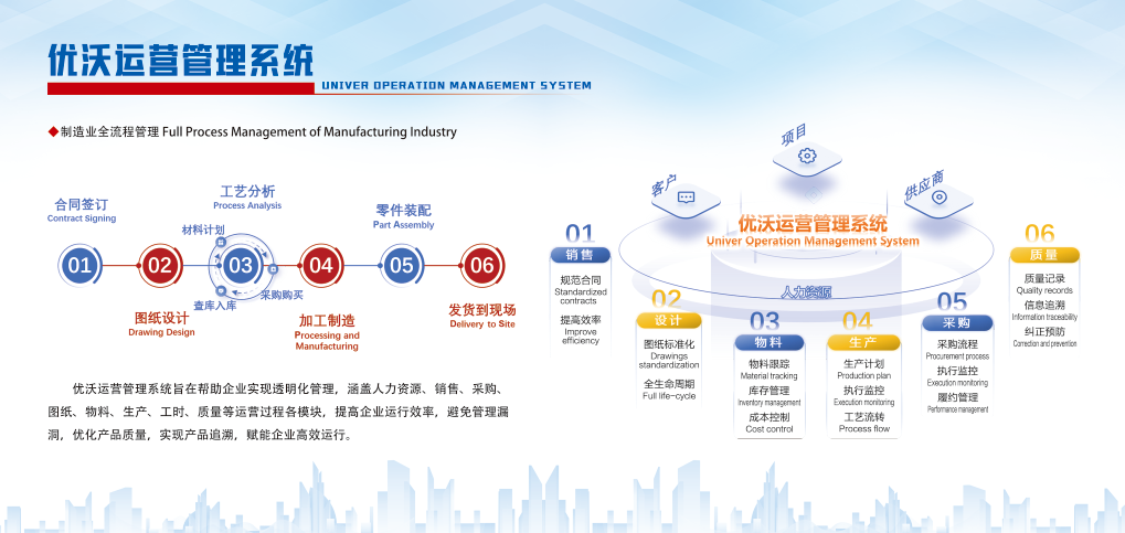 从智能制造层面来看,优沃运营管理系统将传感器技术、机器人技术、工业互联网技术、视觉识别技术等技术应用到生产环节,打通了各环节间的信息壁垒,实现工序间的无缝对接;设计环节,系统实现了参数化设计模块、数据的实时共享和协同工作流程的优化,设计变更次数减少12%;降本增效层面,物料管理和合同管理的应用,节省运维工时5%。