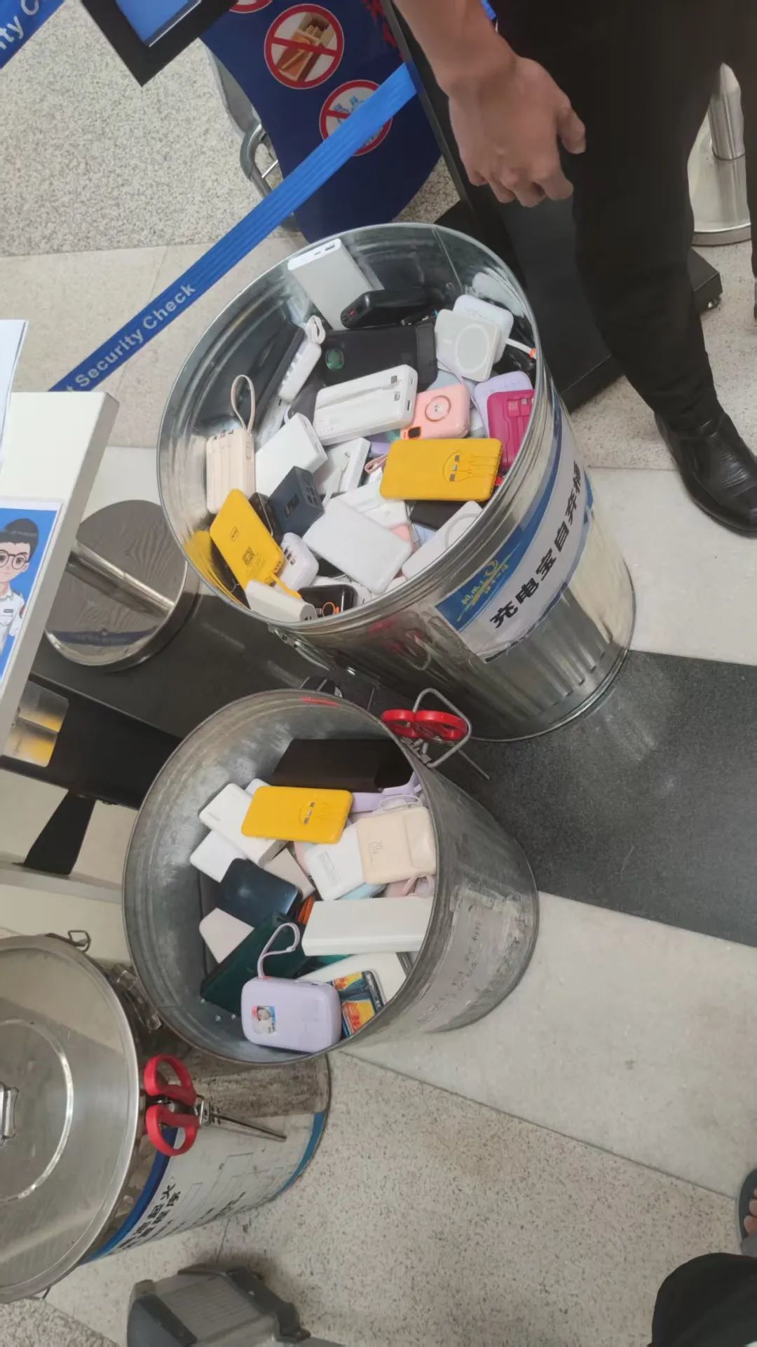 大部分机场在处理不合格充电宝的时候,都是把充电宝放在框里再统一运走。