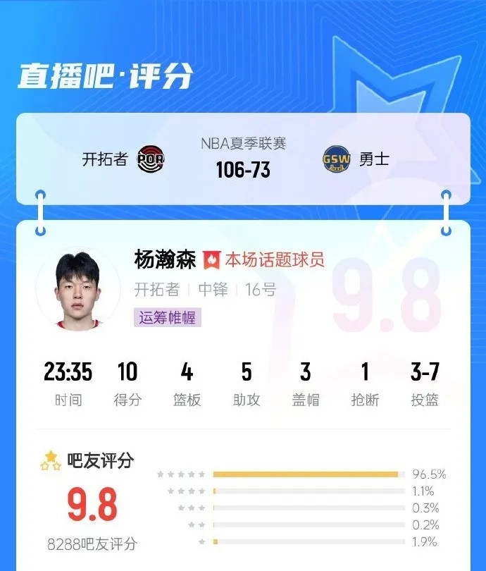 7月12日,NBA夏季联赛,开拓者106-73轻取勇士。本场比赛,杨瀚森首秀出战23分35秒,7投3中,三分3中1,罚球4中3,得到10分4篮板5助攻1抢断3盖帽。赛后,杨瀚森接受了采访。