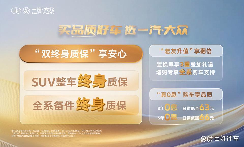 在原有的大众品牌全系车型备件终身质保及全系燃油SUV整车终身质保的基础上,一汽-大众又推出了“老友升值礼”,包含置换早享3重叠加礼遇,及增购专享全系购车支持,更新增了“3年/5年0息购”:凡购买全新一代迈腾、CC家族、ID.纯享/ID.4长续航车型的客户,均可享受3年0息,日供低至63元,至高可省5500元;凡购买揽巡的客户,可享受5年0息,日供低至66元,至高可省10000元,真正做到了0利率无套路。