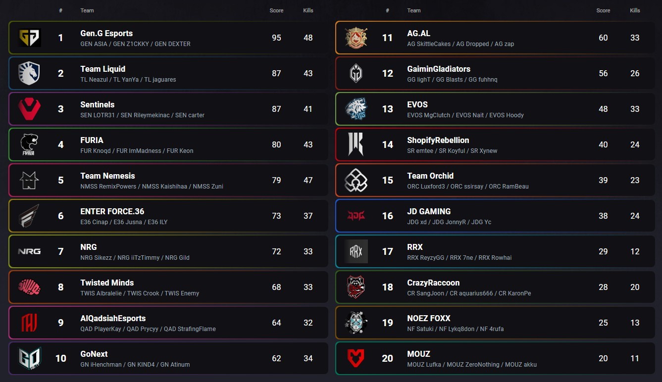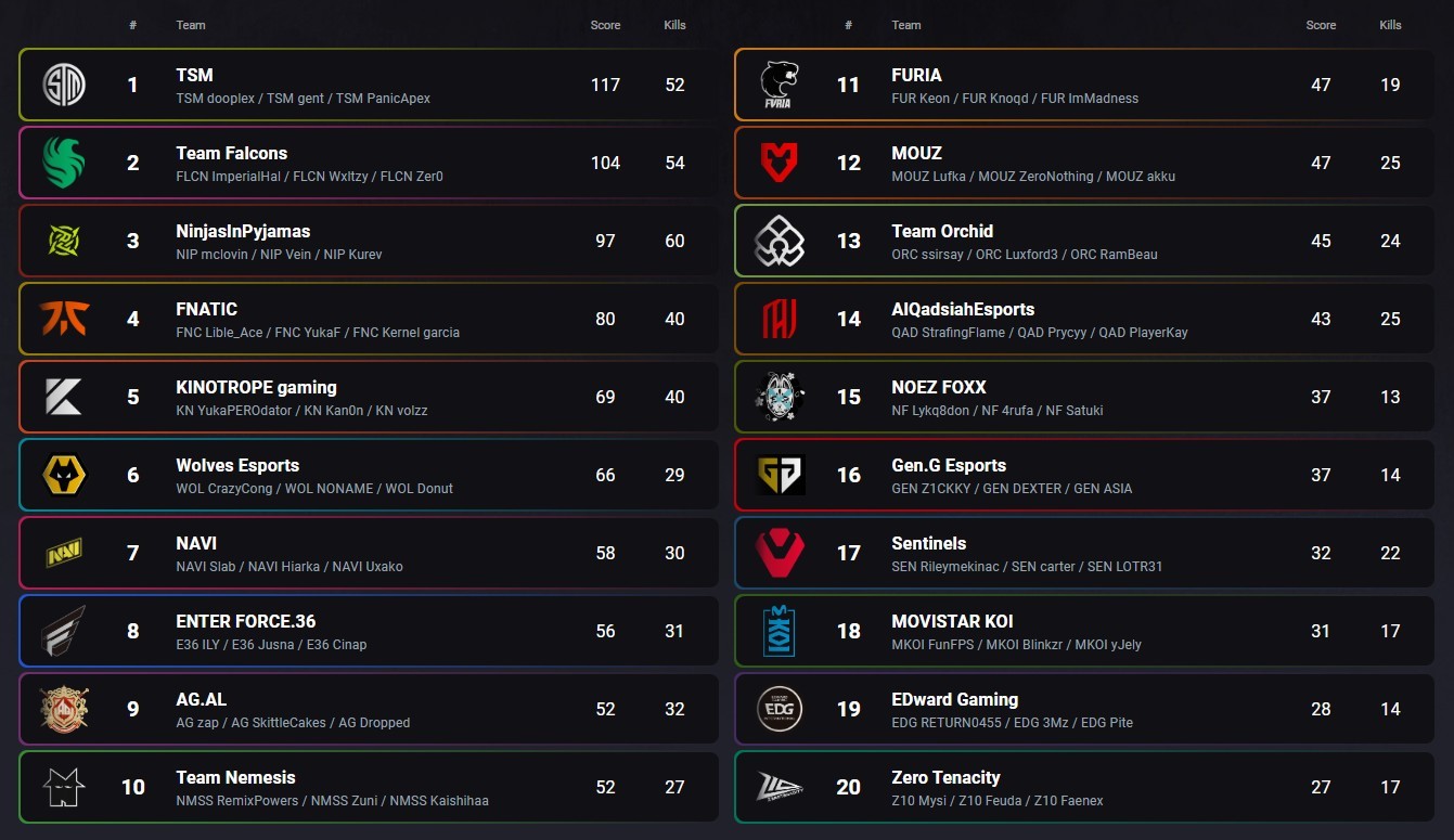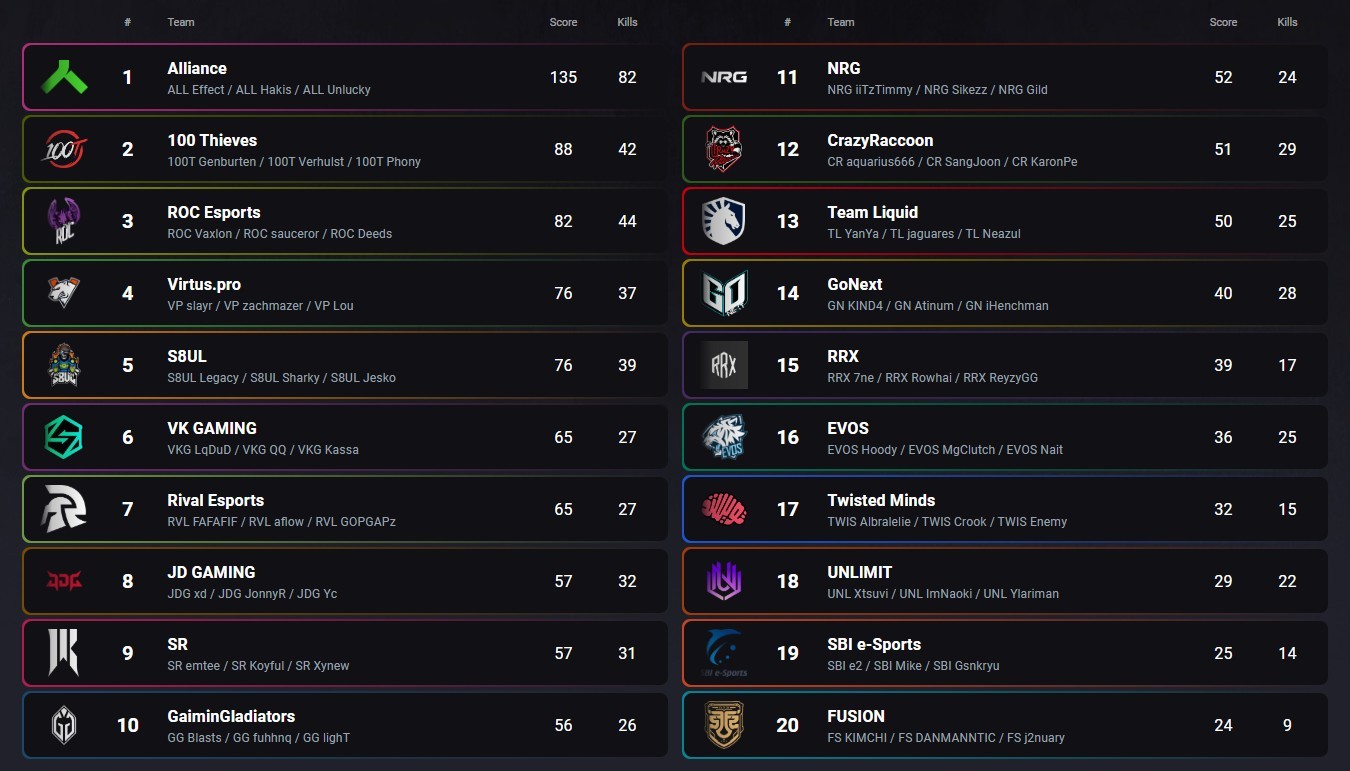 此次APEX项目共40支队伍参加,小组赛A、B组前7直接晋级决赛;第8-17名晋级Last Chance组;第18-20名被淘汰。Last Chance组中前6晋级决赛。