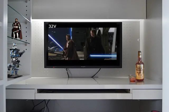桌面能放下32英寸大屏,顶部还配备了环保LED灯,光线柔和护眼;内置蓝牙音箱,360度环绕音效。