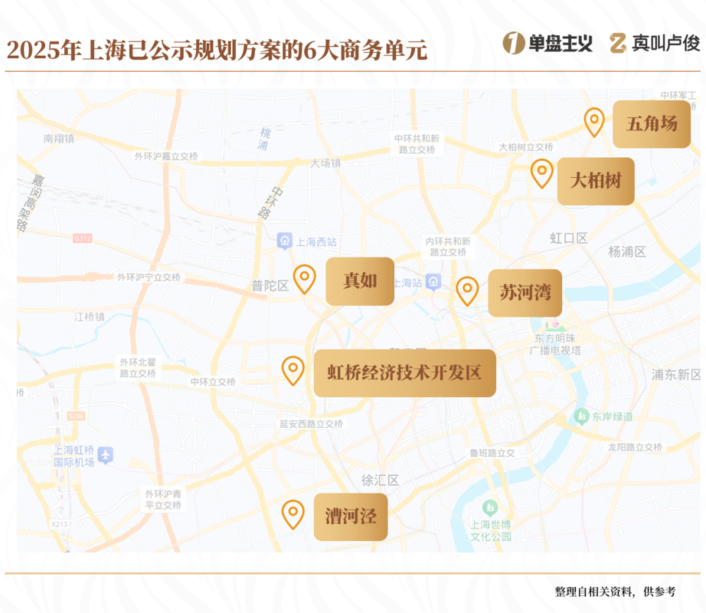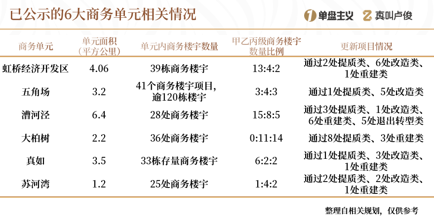 总的来看,6大单元加起来一共20.56平方公里,比黄浦区的总面积还要大,商务楼宇项目的总数足足超过200栋。